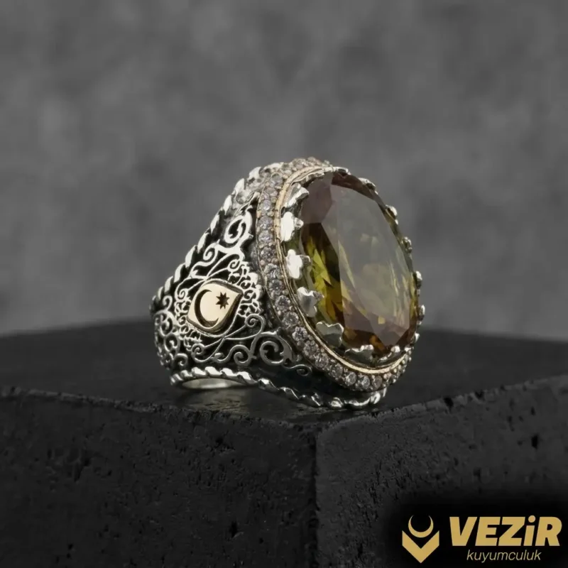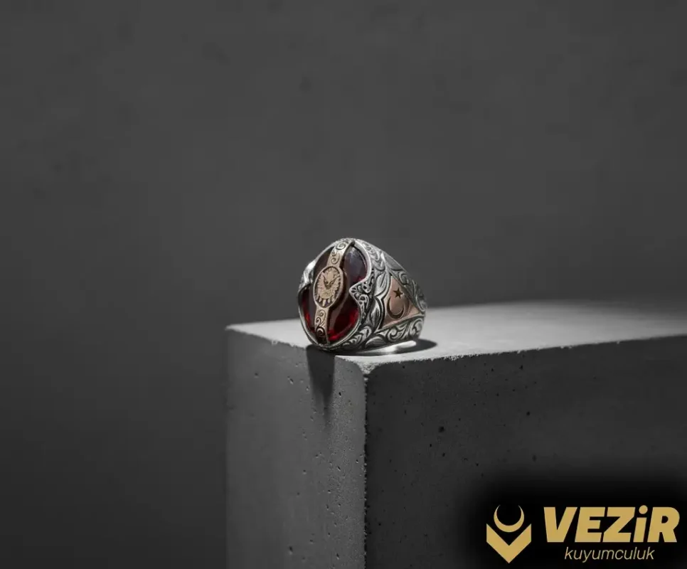 Kırmızı ateş kehribar içerisine oyma olarak isimli Ayyıldız işlenmiştir .