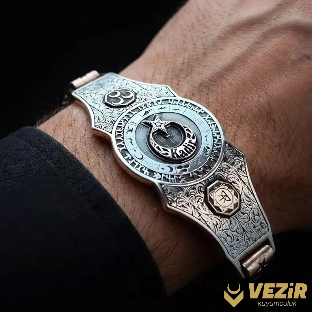 Hilalin üzerine isim işlemeleri yapılırken, bilekliğin etrafı Göktürk alfabesi kullanılarak “Savaş Türklüğün düğünüdür, sefer bizim, zafer Allah’ındır” yazısıyla bezenmiştir. Bu ifade, Türk milletinin kahramanlık ve inancını yansıtmaktadır. Bilekliğin yan kısımlarında ise Oğuz Kağan mührü işlenmiş olup, tarihî dokuyu tamamlamaktadır. Bu model, isteğe bağlı olarak isim, logo veya fotoğraf işlenerek tamamen kişiselleştirilebilmektedir. Hem tarihî hem de anlamlı bir parça olan bu bileklik, kendinizi ifade etmenin veya sevdiklerinize unutulmaz bir hediye sunmanın mükemmel bir yoludur.