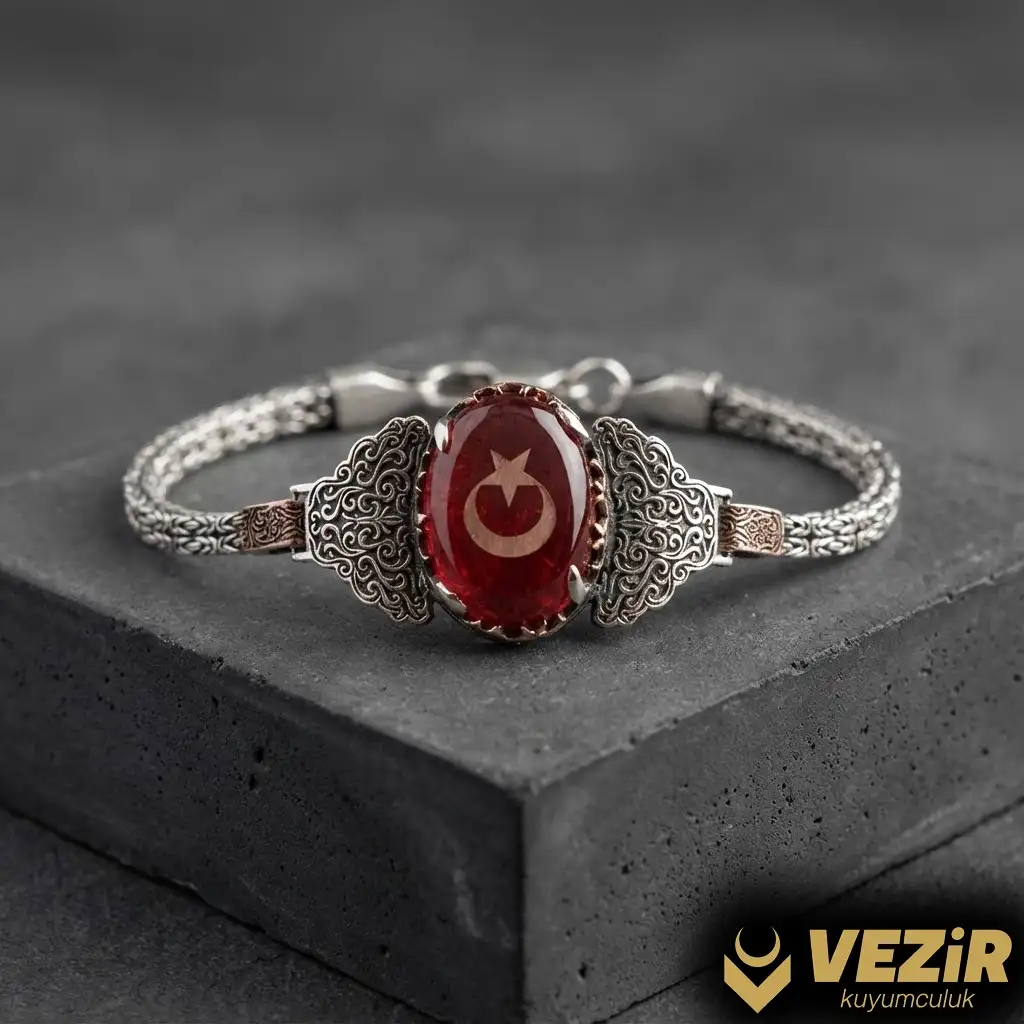Bilekliğin merkezinde yer alan Ayyıldız motifi, Türk kültüründe önemli bir sembol olarak kabul edilir. Kırmızı ateş kehribar üzerine oyma olarak işlenen bu motif, bilekliğe hem görsel hem de manevi bir anlam kazandırır.