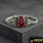 “Ayyıldız” gümüş bileklik, kırmızı ateş kehribar içerisine oyma olarak işlenmiş isimli Ay Yıldız motifiyle zarif ve anlamlı bir tasarım sunar. 925 ayar gümüşten yapılan bu bileklik, hem şıklığı hem de manevi değeriyle öne çıkar. Unutulmaz bir hediye seçeneği.