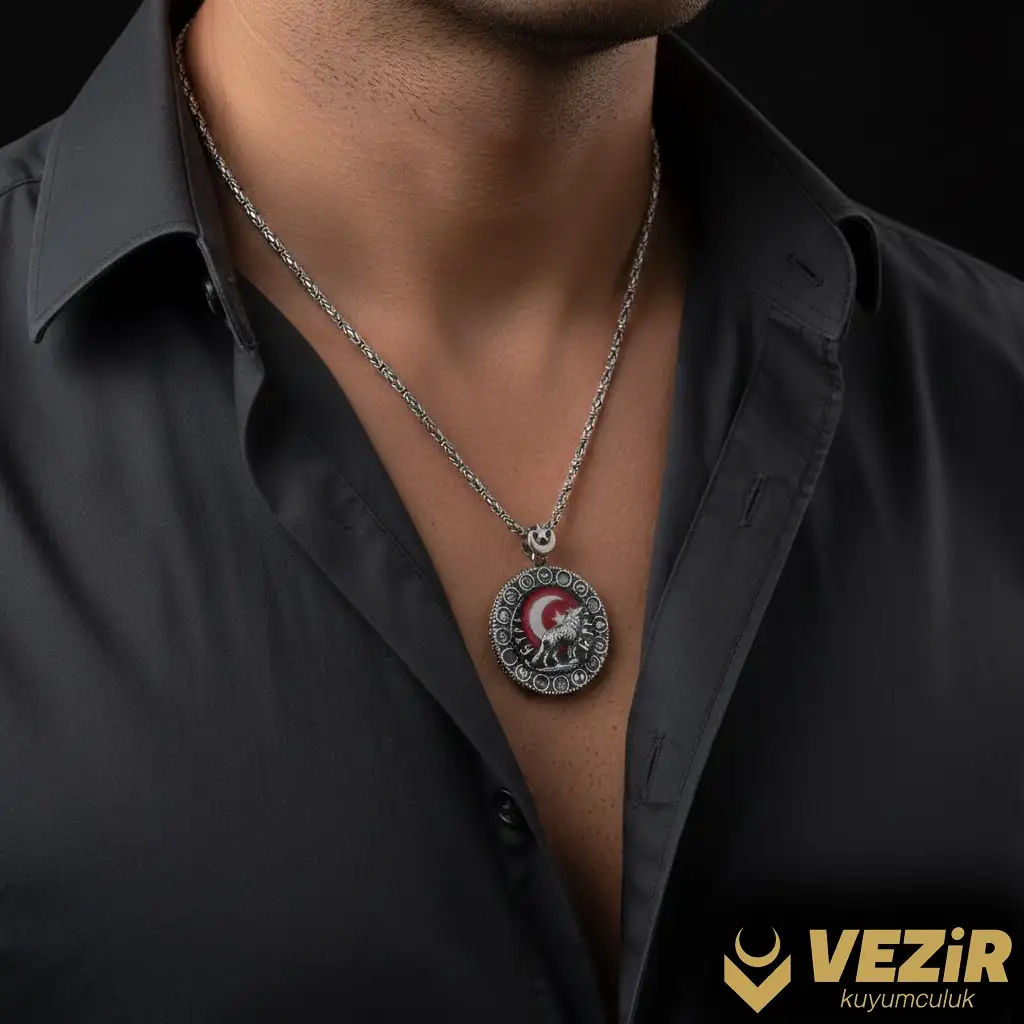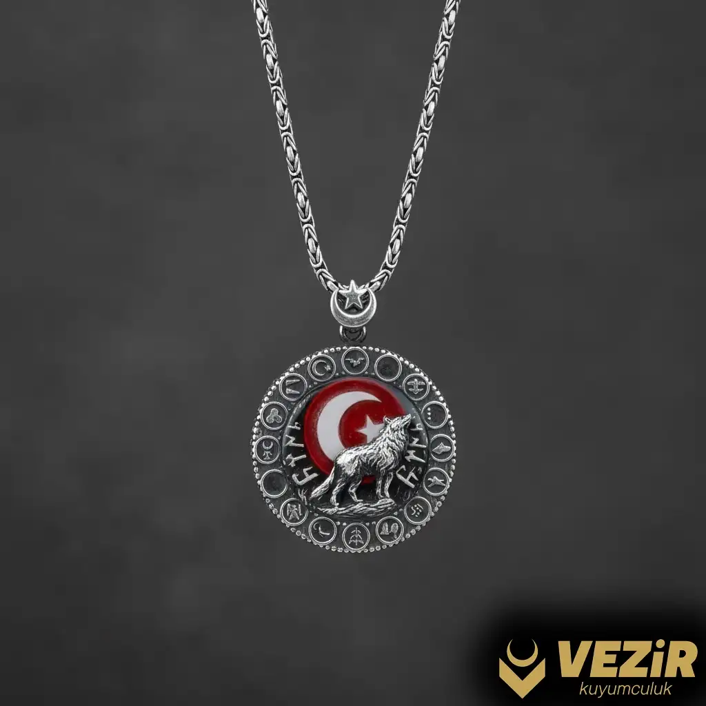 Tasarım ve Malzeme: Bozkurt Gümüş Madalyon, 925 ayar gümüşten üretilmiş olup, 2 mm kalınlığında ve 60 cm uzunluğunda kral zincir ile tamamlanmıştır. Bu özel tasarım, tarih ve kültürün bir araya geldiği bir sanat eseridir.