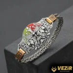 Çift başlı aslan figürüyle tasarlanan bu gümüş bileklik, gücü ve asaleti bileğinizde taşımanızı sağlar. Sarı ve kırmızı detaylarla zenginleştirilmiş tasarımı, üzerine işlenebilen isim-soyisim ile tamamen size özel hale gelir.