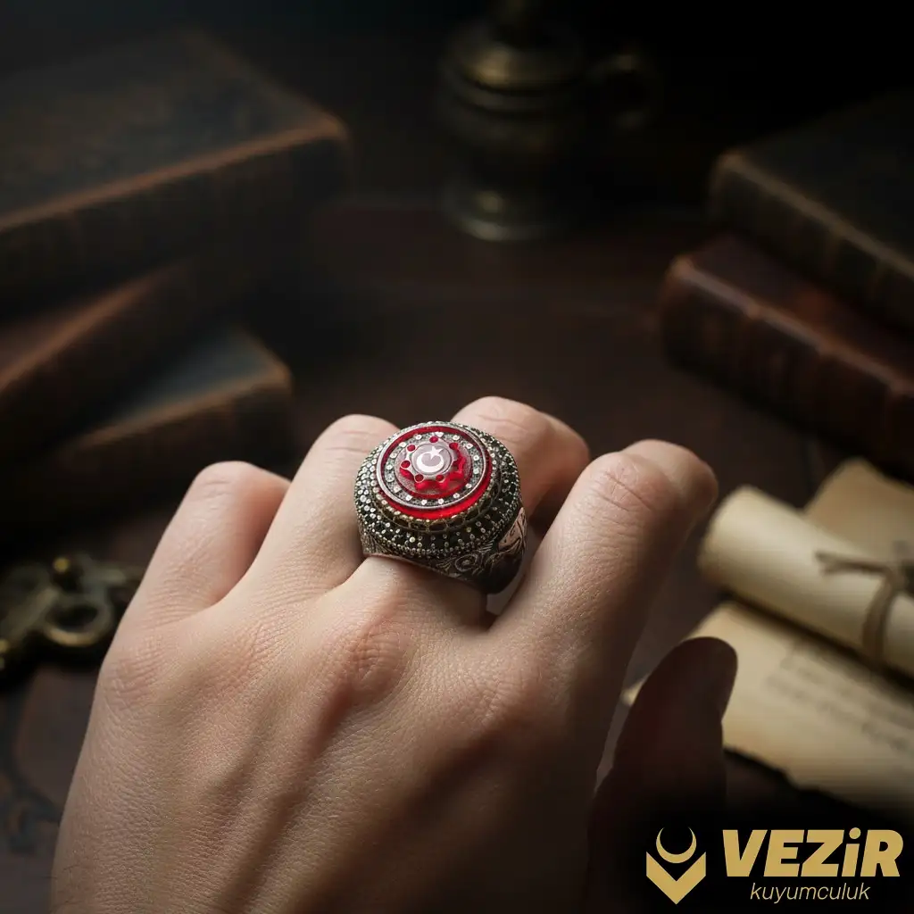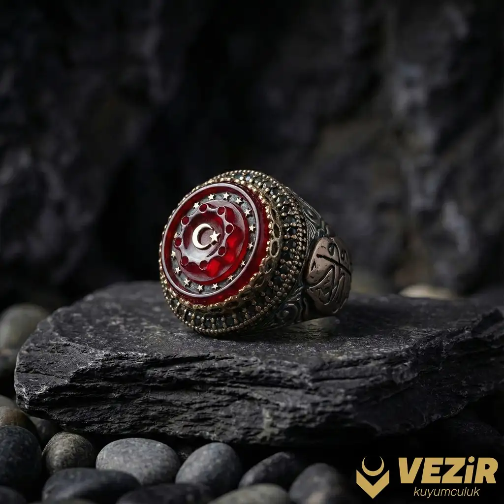 Yüzüğün tasarımında yer alan ay yıldız motifleri, vatan sevgisini ve milli duyguları simgeler. Osmanlı İmparatorluğu’nun ve Türkiye Cumhuriyeti’nin sembollerinden olan bu motifler, tarihteki gücü ve zaferi temsil eder. Ay yıldız, milliyetçiliğin ve vatanseverliğin bir ifadesi olarak bu yüzükte öne çıkar.