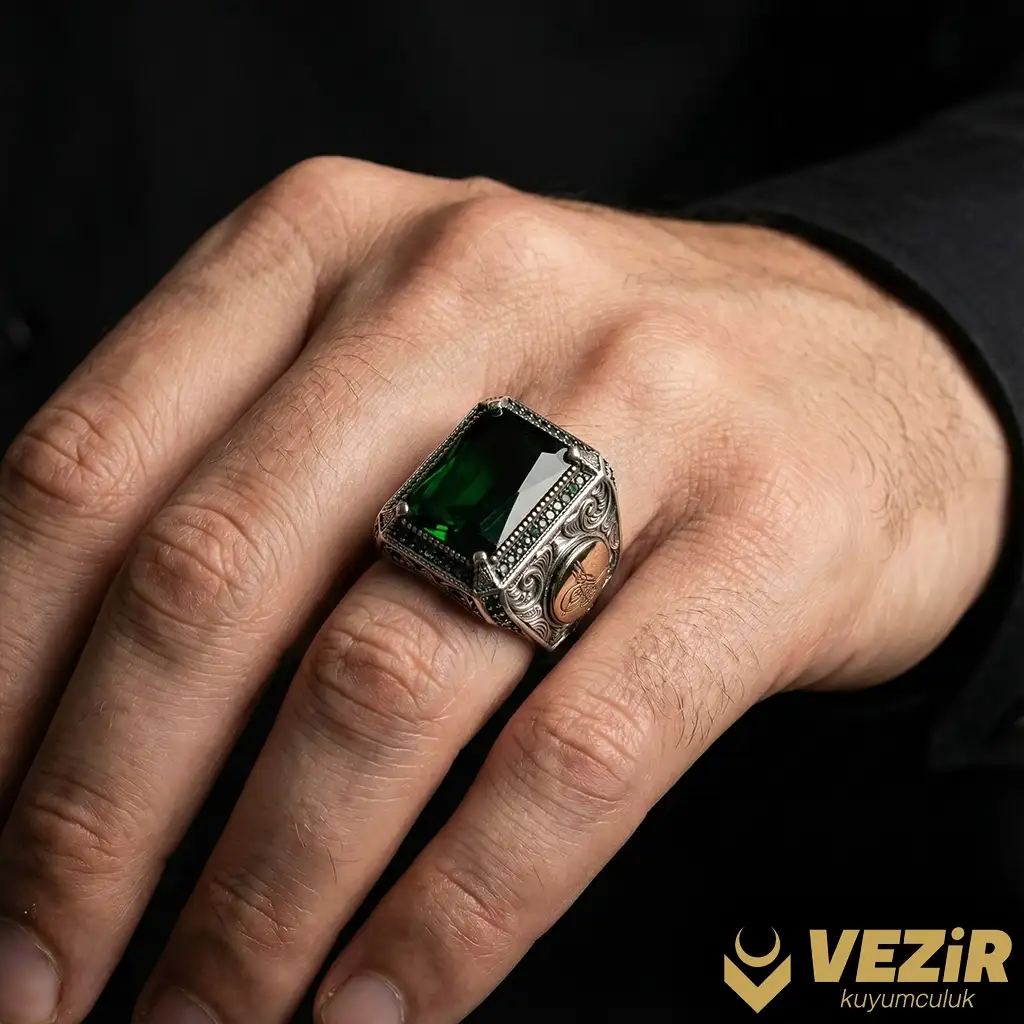 Yüzüğün yan kısımlarına işlenmiş olan Osmanlı tuğrası motifleri, bu tasarımı benzersiz kılar. Osmanlı tuğrası, İmparatorluğun resmi ve prestijli bir simgesi olarak bilinir ve bu yüzükteki motifler, geleneksel bir bağ kurarken aynı zamanda estetik bir görünüm sunar. Motifler, yüzüğe tarihsel bir derinlik kazandırırken, modern bir estetikle harmanlanmış olarak şıklığınızı tamamlar.