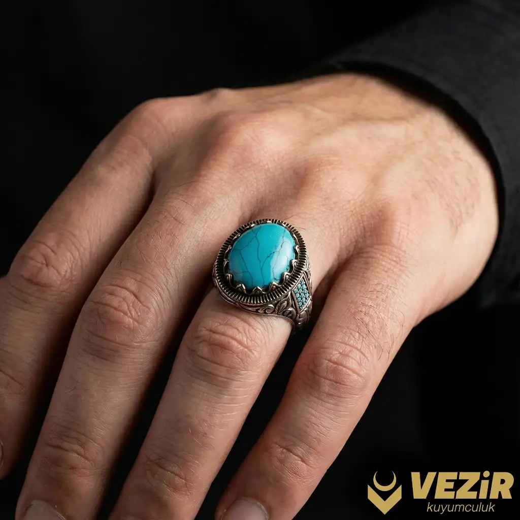 Yüzüğün ortasında yer alan firuze taşları, mıhlama tekniği ile dikkatlice yerleştirilmiştir. Bu teknik, taşların güvenli bir şekilde sabitlenmesini ve yüzüğün estetik görünümünün korunmasını sağlar. Firuze taşları, yüzüğün merkezinde parlaklık ve şıklık sunarak tüm dikkatleri üzerine çeker.