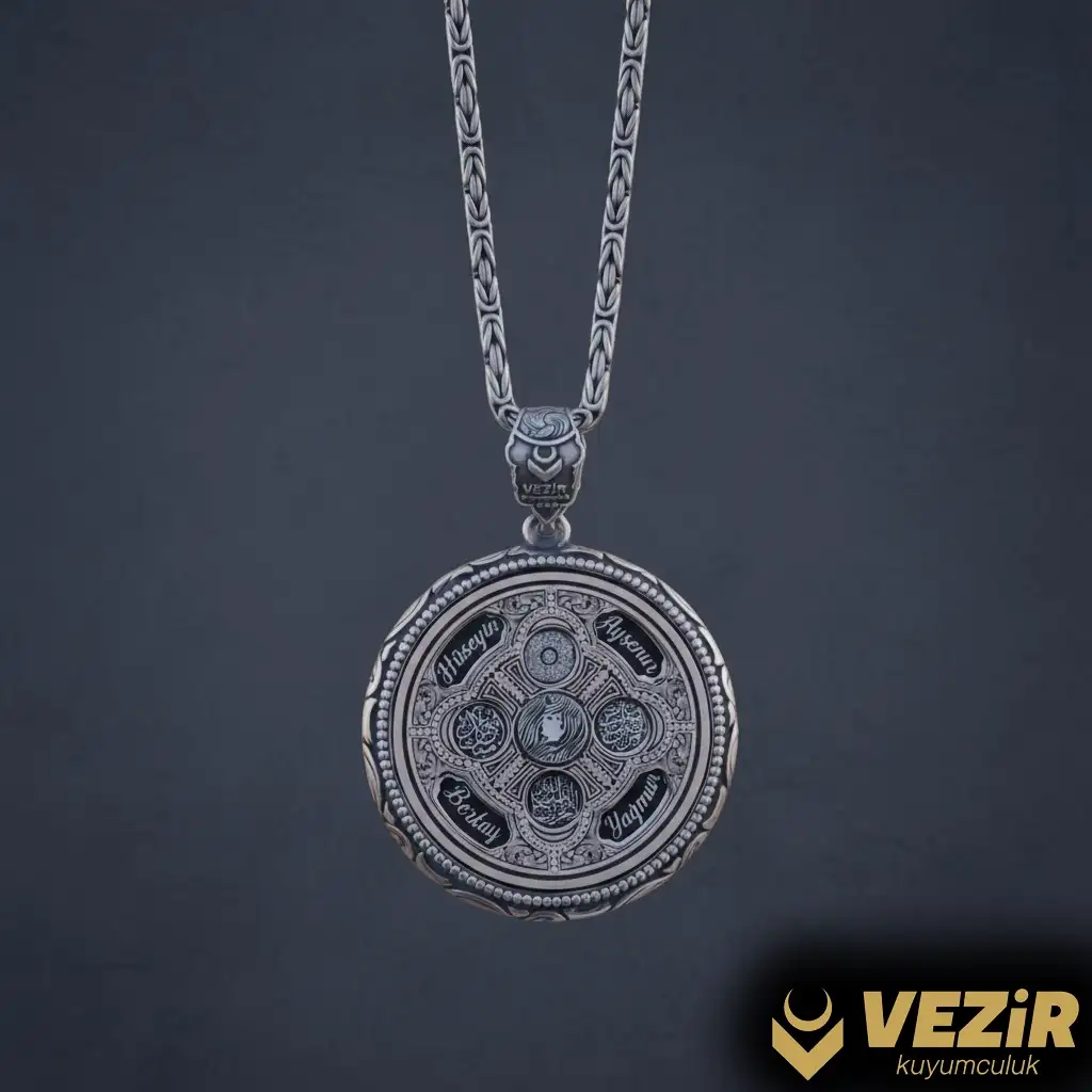 Üst kısmı dönerli sistem olan kolyenin ön ve arka yüzlerinde farklı dualar ve isimler işlenebilir. Eşinizin ve çocuklarınızın isimlerini veya sevdiğiniz bir sözü kolyeye işletebilirsiniz. Ayrıca, kişiye özel harf logo isim tasarımı da yapılabilir.