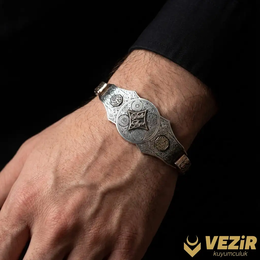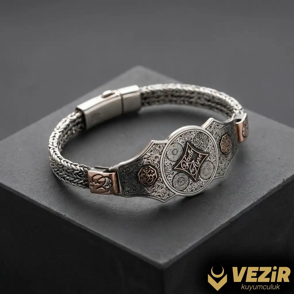 Bu sureler ve ayetler, bilekliğe derin bir manevi değer katarken, kişinin iç huzurunu ve inancını simgelemektedir. Orta kısımda çift isimleri işlenerek kişiye özel bir dokunuş eklenmiştir. Bilekliğin ve yüzüğün kenarlarında ise Arapça “aşk” yazısı yer alır, bu da ürüne romantik bir anlam kazandırır. Bu model, istenildiğinde isim, logo veya fotoğraf eklenerek tamamen kişiselleştirilebilir. Anlamlı bir hediye arayışında olanlar veya kendini ifade etmek isteyenler için ideal olan bu bileklik, manevi ve estetik bir değeri aynı anda sunar.