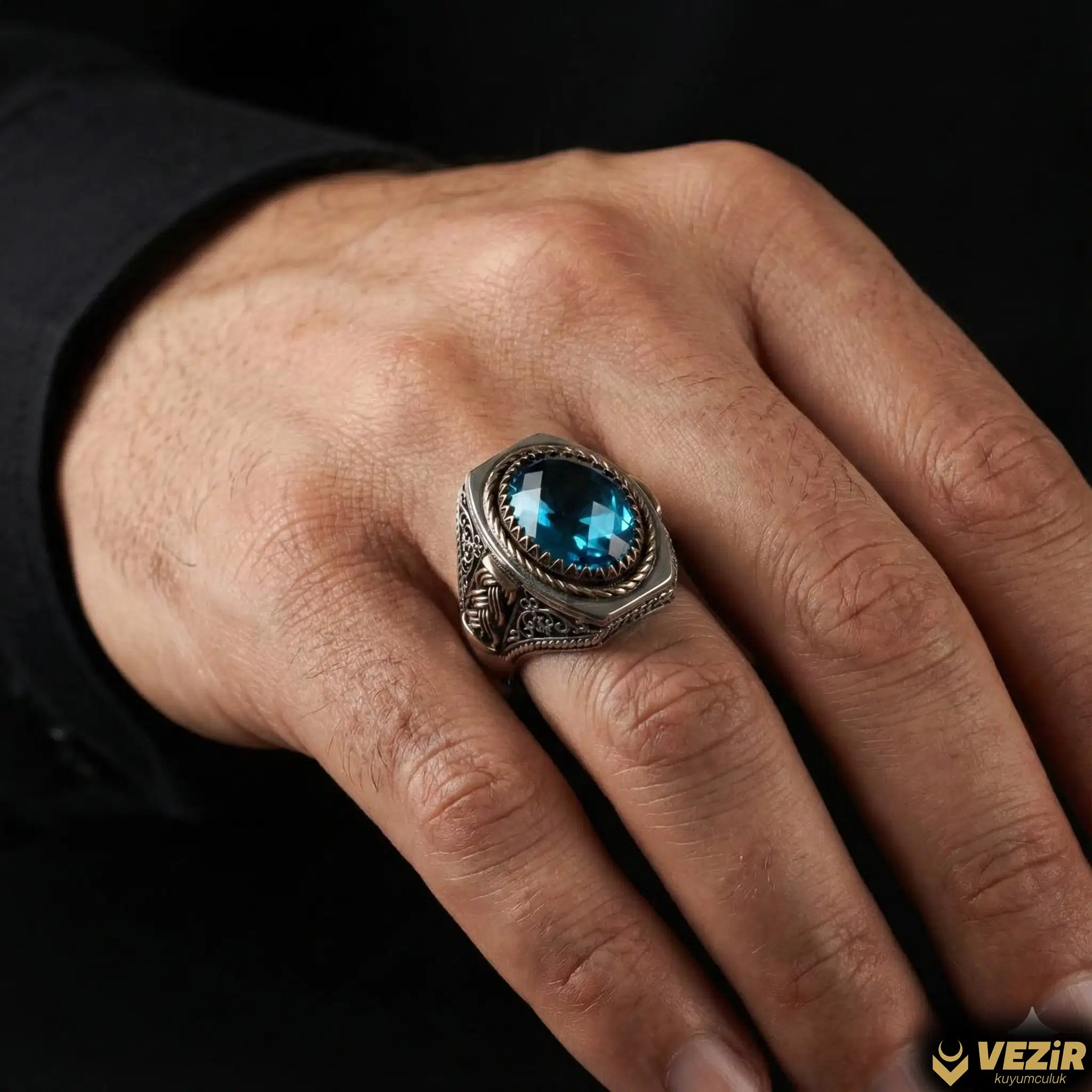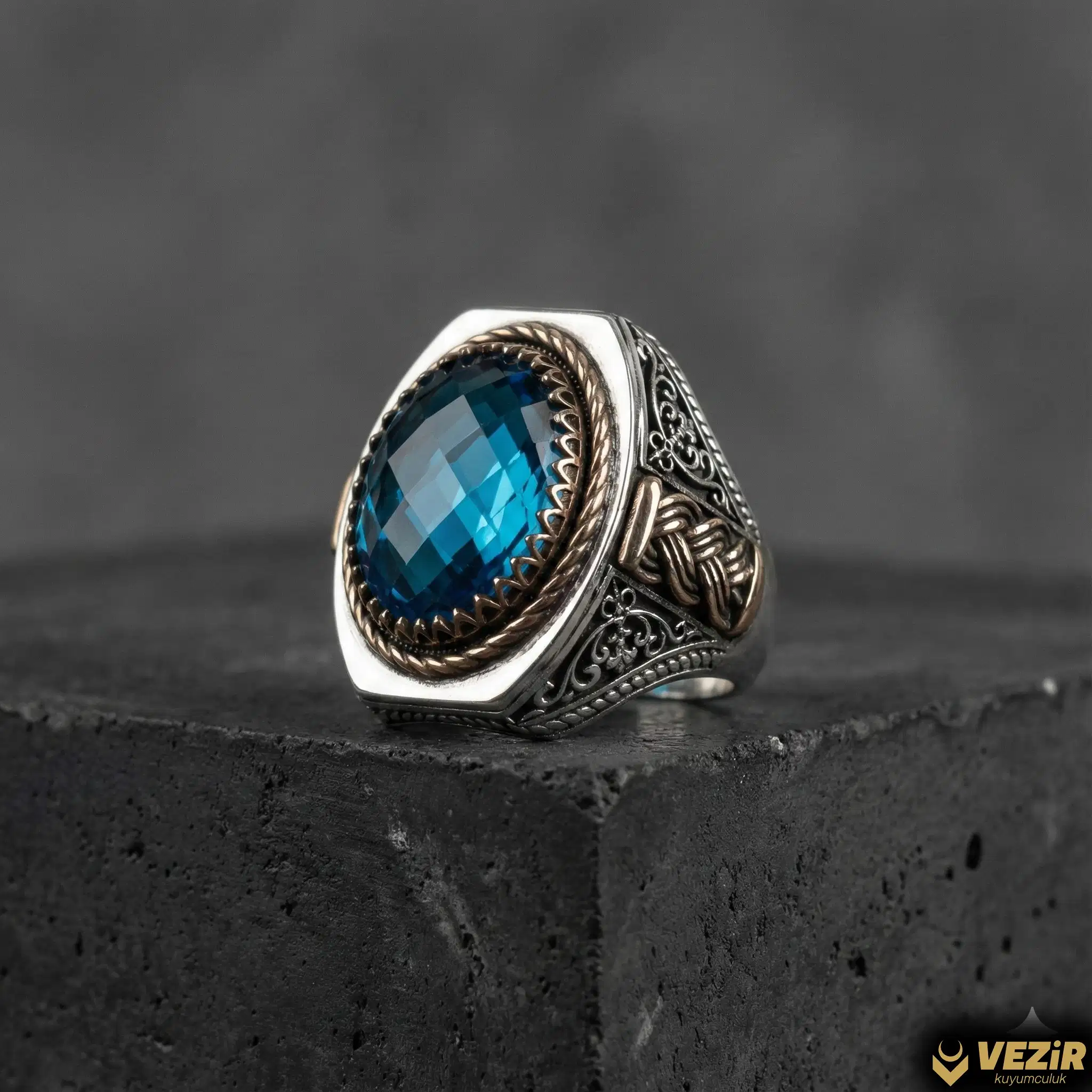 925 ayar özel tasarım gümüş yüzük üzerine faset kesim mavi zirkon taşı işlendi. Yüzüğün yan kısımlarına sarmal desen motifi işlendi.