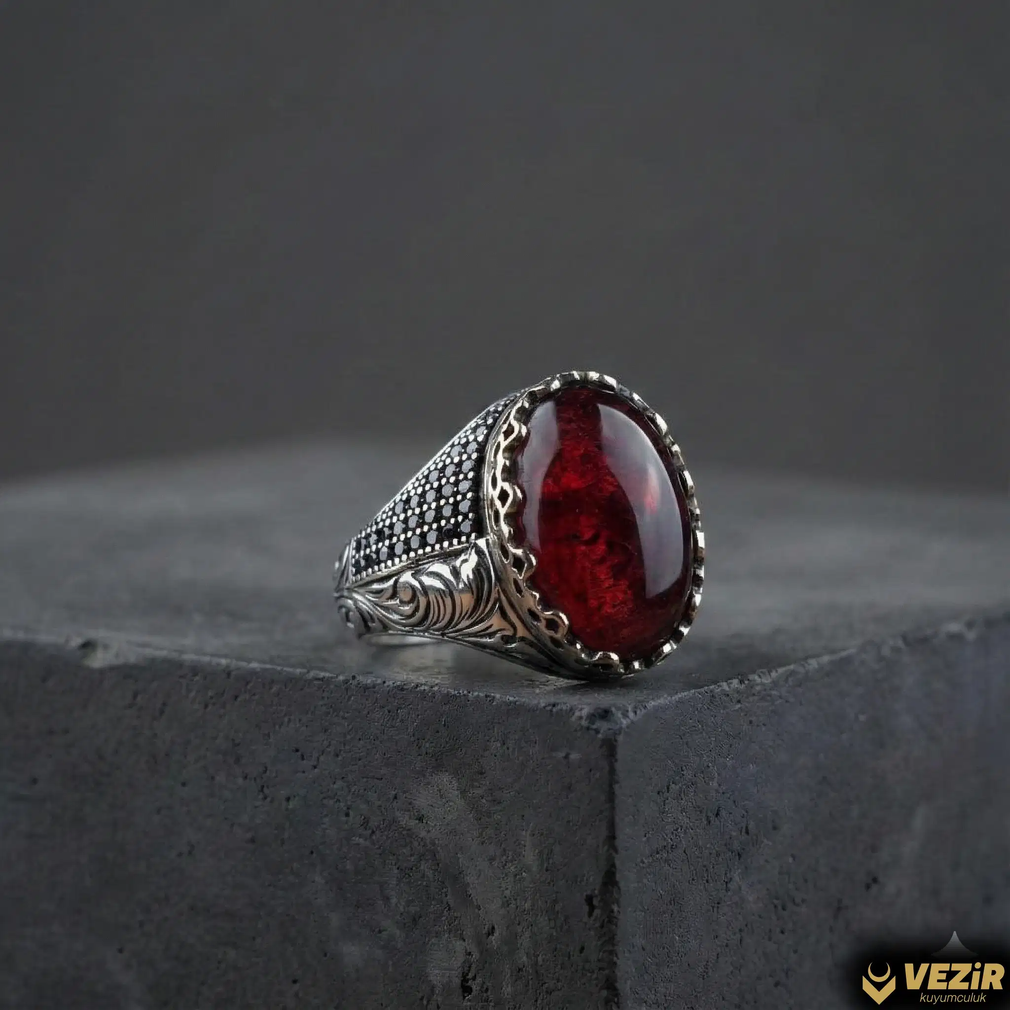 Yüzüğün karanlığı aydınlatan garnet taşları, tasarıma dinamizm ve enerji katar. Garnet taşlarının göz alıcı ışıltısı, yüzüğe çarpıcı bir görünüm kazandırır. Ayrıca, bu taşlar kullanıcısına pozitif bir enerji ve canlılık sağlar. Garnet taşlarının enerjisi, yüzüğün estetik çekiciliğini artırırken, aynı zamanda ruhsal denge ve pozitif hisler sunar.