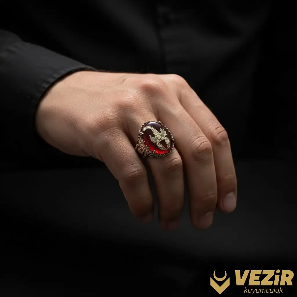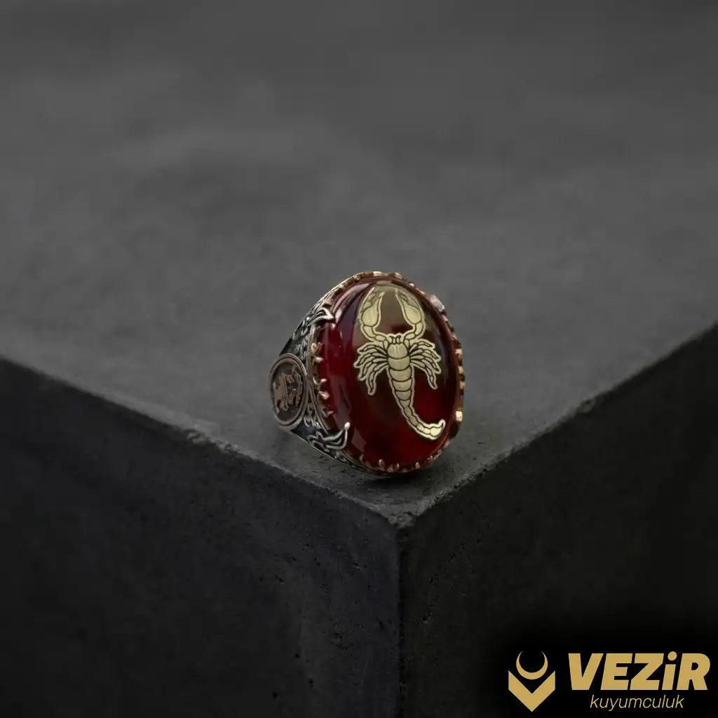 Yüzüğün dikkat çekici özelliği, oyma akrep tasarımıdır. Akrep figürü, güç, koruma ve direnci simgeler. Bu özel işleme, yüzüğe sadece estetik bir değer katmakla kalmaz, aynı zamanda manevi bir anlam da taşır. Akrep figürü, gücünüzü ve kişisel karakterinizi ifade etmenin anlamlı bir yoludur.