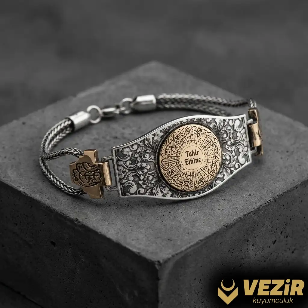 Özgün tasarımı ve anlamlı içeriğiyle dikkat çeken bu bileklik, çevresindeki gravür motifleri ve orta bronz parçasında “inşirah” suresi ile eş isimleri bulundurur. Tilki kuyruğu modeli zinciri tutan yan parçalarda Arapça “aşk” ve “kör düğüm” işlenmiştir. Günlük kullanımda veya özel günlerde tercih edilebilecek anlamlı bir aksesuardır.