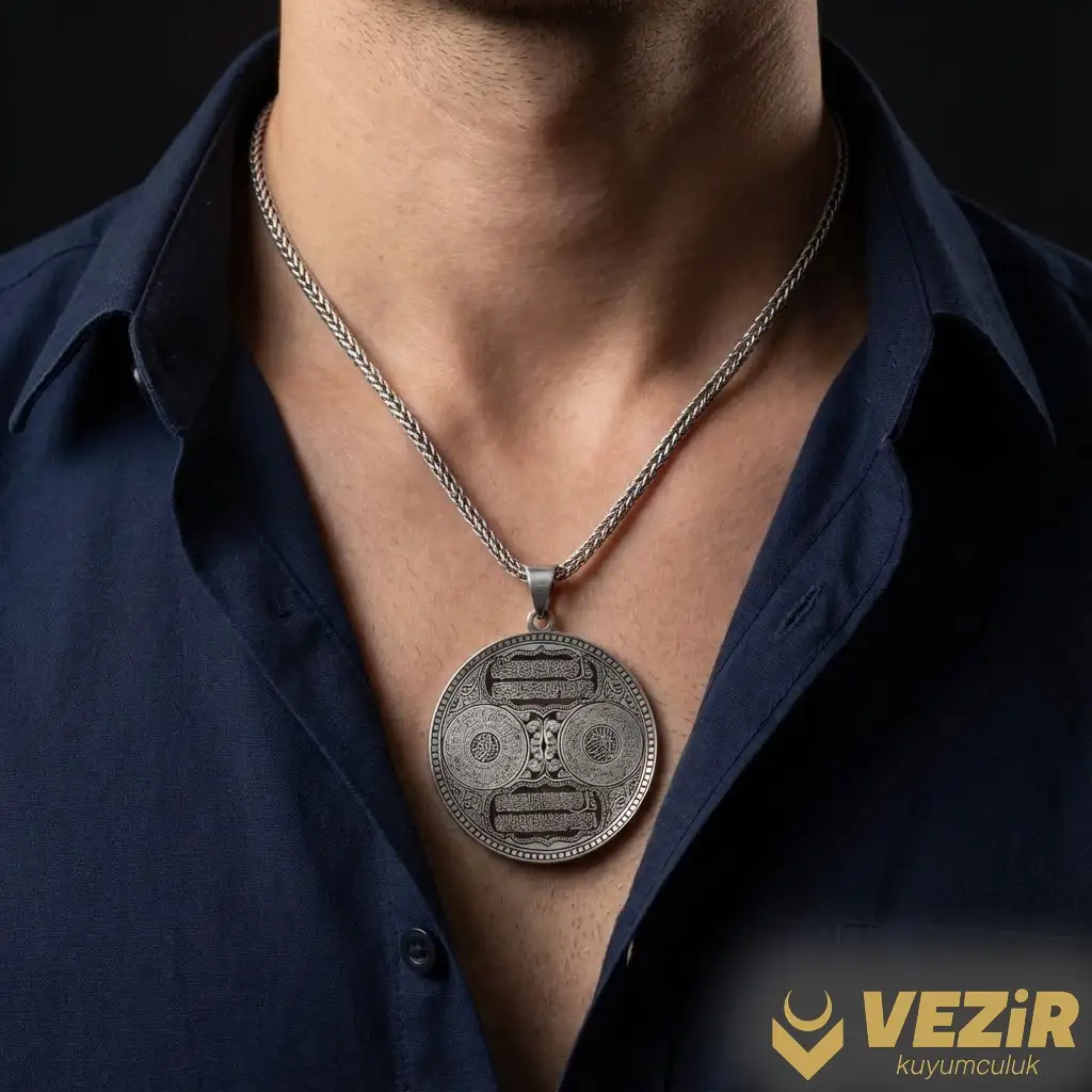 Koruma Dualı Gümüş Madalyon, Ayetel Kürsi, İnşirah, Nas ve Felak surelerinin manevi gücünü taşır. 925 ayar gümüşten üretilmiş bu özel madalyon, 4 cm çapında olup, 60 cm uzunluğundaki gümüş zinciri ile birlikte gelir. Estetik tasarımı ve yüksek kalitesiyle koruma ve huzur sunar.