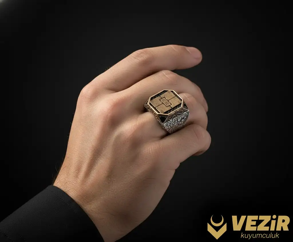 925 ayar gümüşten üretilmiş olan bu yüzük, hem dayanıklılığı hem de şıklığı ile dikkat çeker. Siyah mikro taş üzerine işlenmiş Kufi hat sanatı, yüzüğe derinlik ve karakter kazandırarak göz alıcı bir görünüm sunar. Her detay özenle işlenmiş olup, yüzüğün hem manevi hem de estetik değerini artırır.