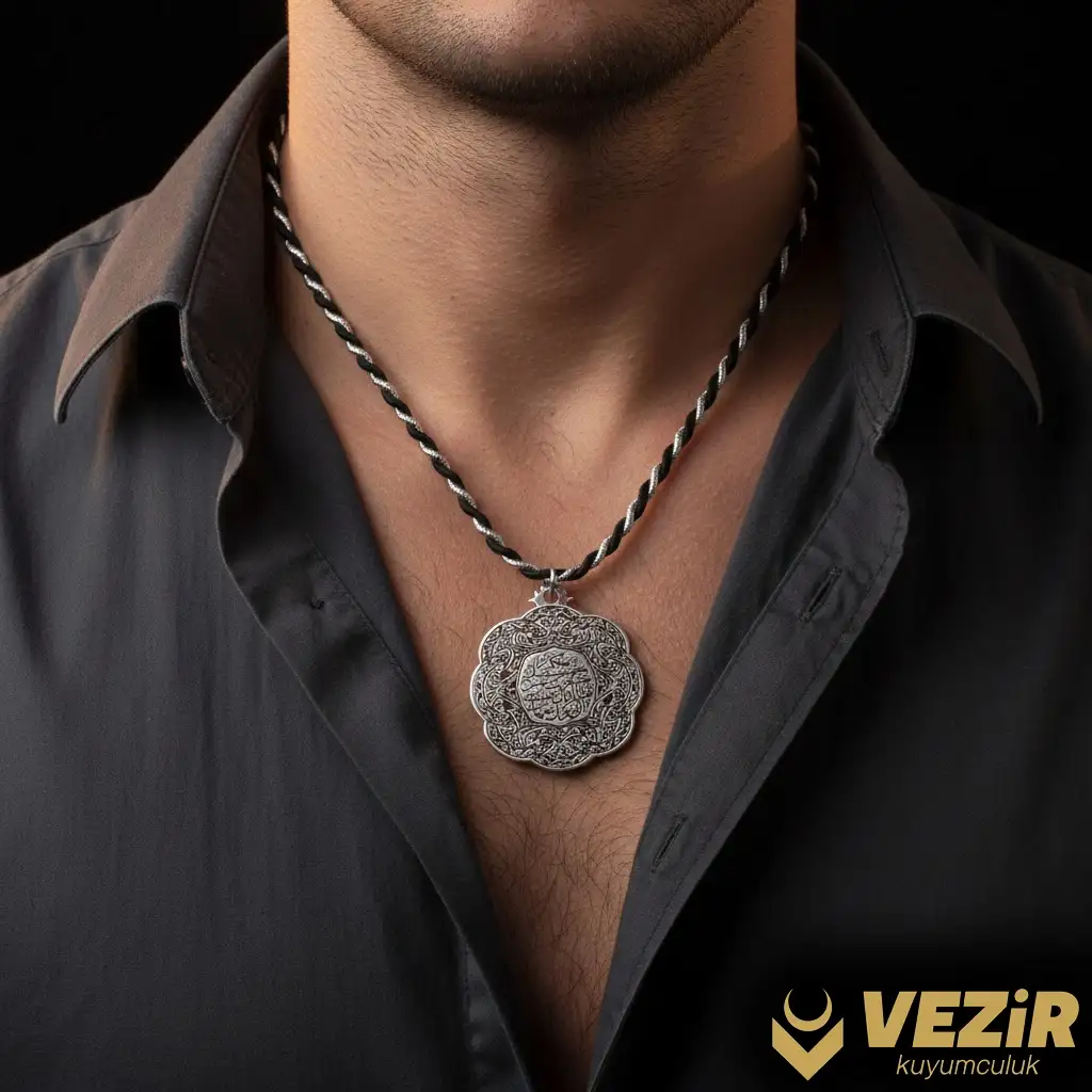 Yazının etrafında, detaylı bir el işçiliğiyle işlenmiş gümüş çerçeve bulunur. Bu çerçeve, madalyona estetik bir dokunuş katarak, tasarımın zarif ve özenli bir şekilde tamamlanmasını sağlar. Gümüş çerçeve, madalyonun manevi ve estetik değerini artırır.