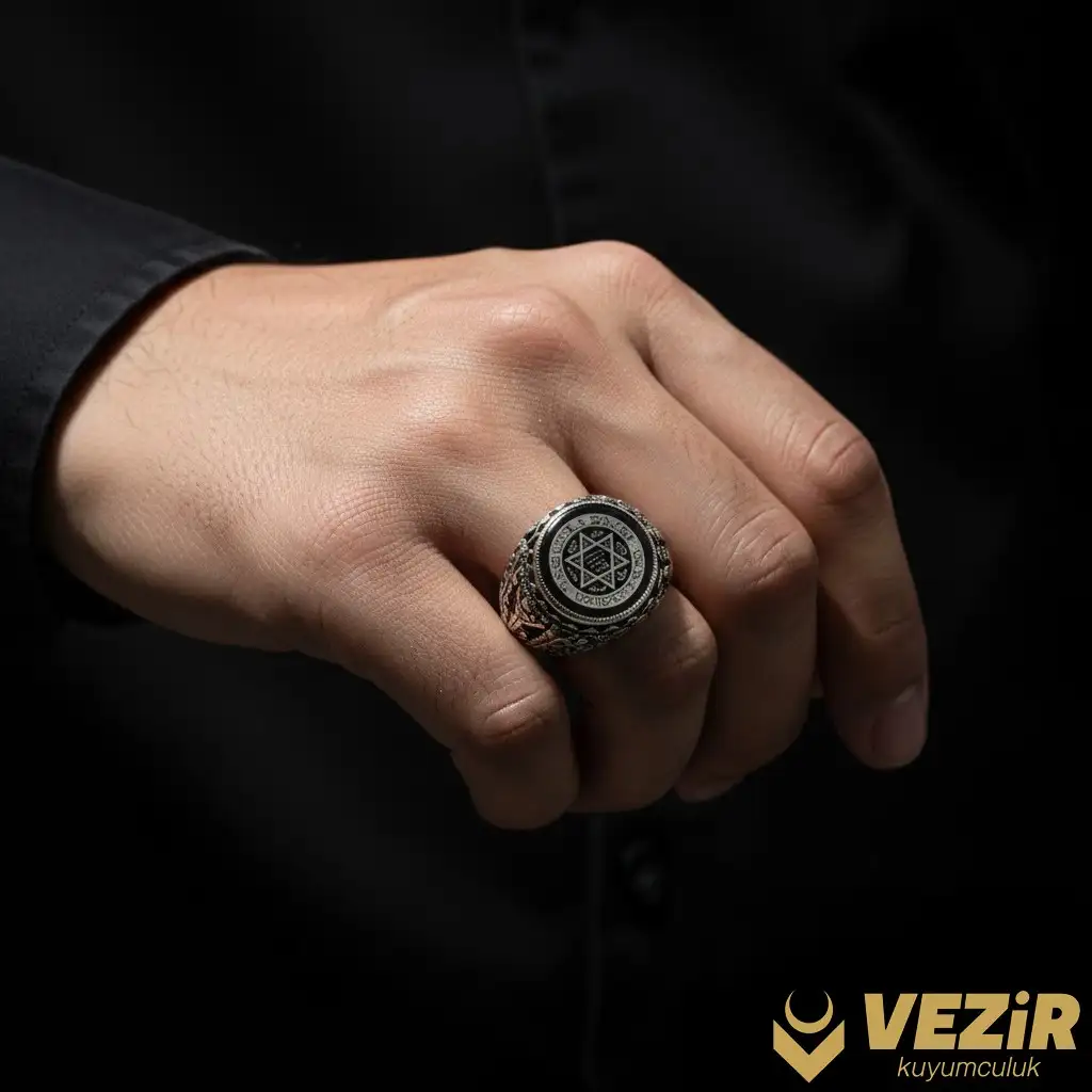 Yüzüğün mikro taşlarla işlenmiş detayları, estetik bir zarafet ve derinlik sunar. Bu taşlar, Süleyman Mührü motifinin çevresine yerleştirilmiş ve yüzüğe parlaklık ve şıklık kazandırmıştır. Mikro taşların ışıl ışıl yansıması, yüzüğün her açıdan dikkat çekici olmasını sağlar.
