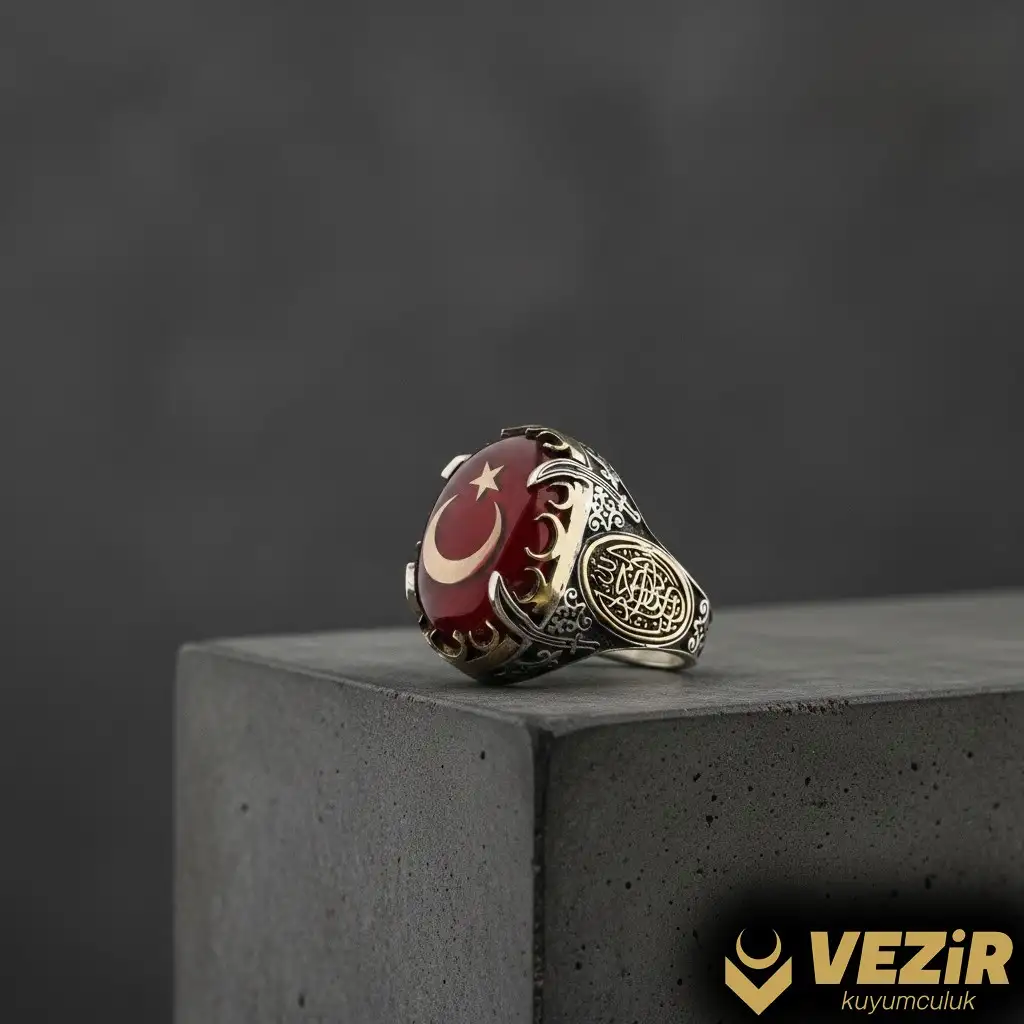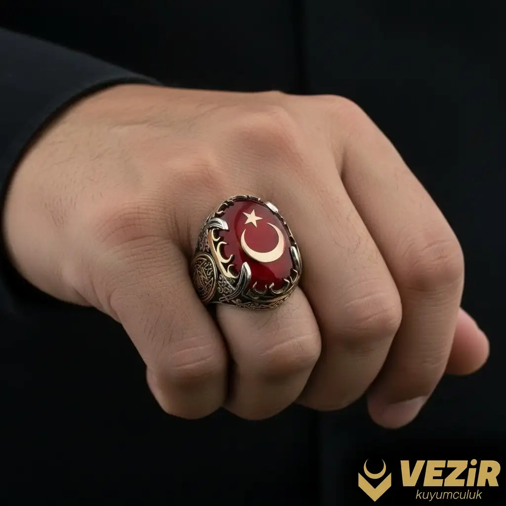 Yüzüğün tasarımı, estetik ve zarif detaylarla zenginleştirilmiştir. Kırmızı ateş kehribarın ışıltısı ve Ay Yıldız motifinin zarif oyma işçiliği, yüzüğe göz alıcı bir görünüm kazandırır. Yüzüğün her parçası, titizlikle işlenmiş ve yüksek kaliteli malzemeler kullanılarak üretilmiştir.