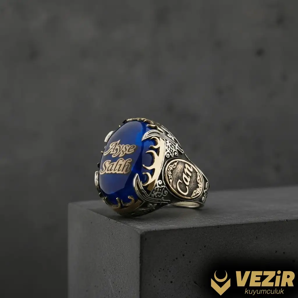 Sefer Mavi Taşlı Gümüş Yüzük, kişiye özel isimlerle özelleştirilmiş bir tasarıma sahiptir. Yüzüğün üzerinde ve yanlarında yer alan isimler, yüzüğü sahibine özgü hale getirir ve ona anlam katar. Bu kişiselleştirme, yüzüğün kullanıcıya özel bir parça olmasını sağlar ve kişinin tarzını, karakterini yansıtır. Her isim özenle işlenmiş olup, yüzüğün özgünlüğünü ve kişisel değerini artırır.