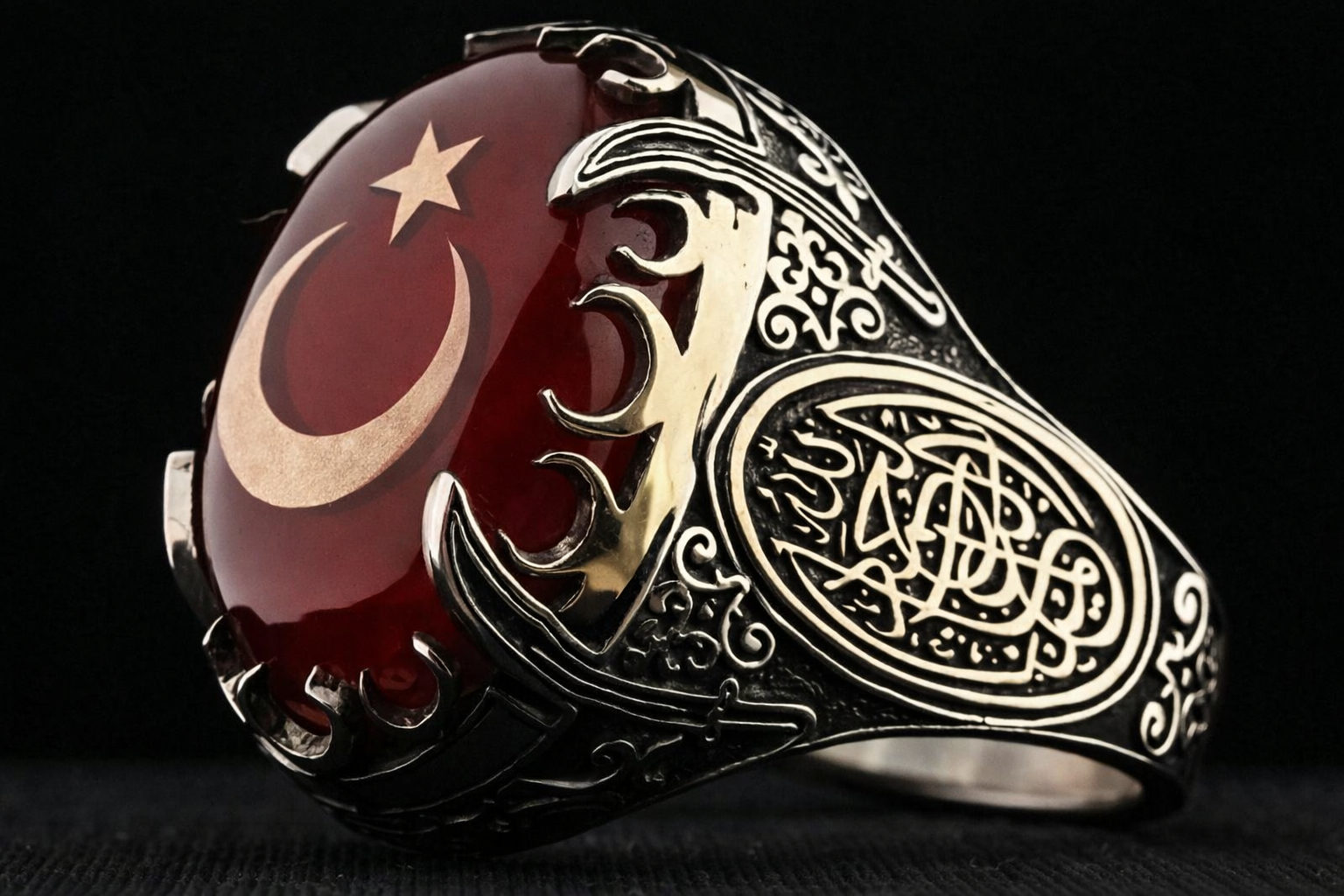 Yüzüğün yan kısımlarında yer alan Arapça hat şeklindeki “cennet kılıçların gölgesi altındadır” yazısı, tarihi ve mistik bir hava katar. Bu ifade, kutsal bir anlam taşıyarak yüzüğün anlamını ve derinliğini artırır. Arapça hat sanatıyla işlenen yazılar, yüzüğe tarihi bir dokunuş ekler.
