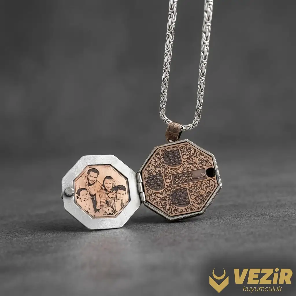 Ürünümüz 925 ayar gümüşten yapılmış olup üst kısmına Ayet-el Kürsi iç kısmına sağ tarafa Felak Nas ihlas sureleri Sol iç kısmına ise özelleştirme yapılmış olup arka kısmına eşlerin baş harfleri işlenmiştir