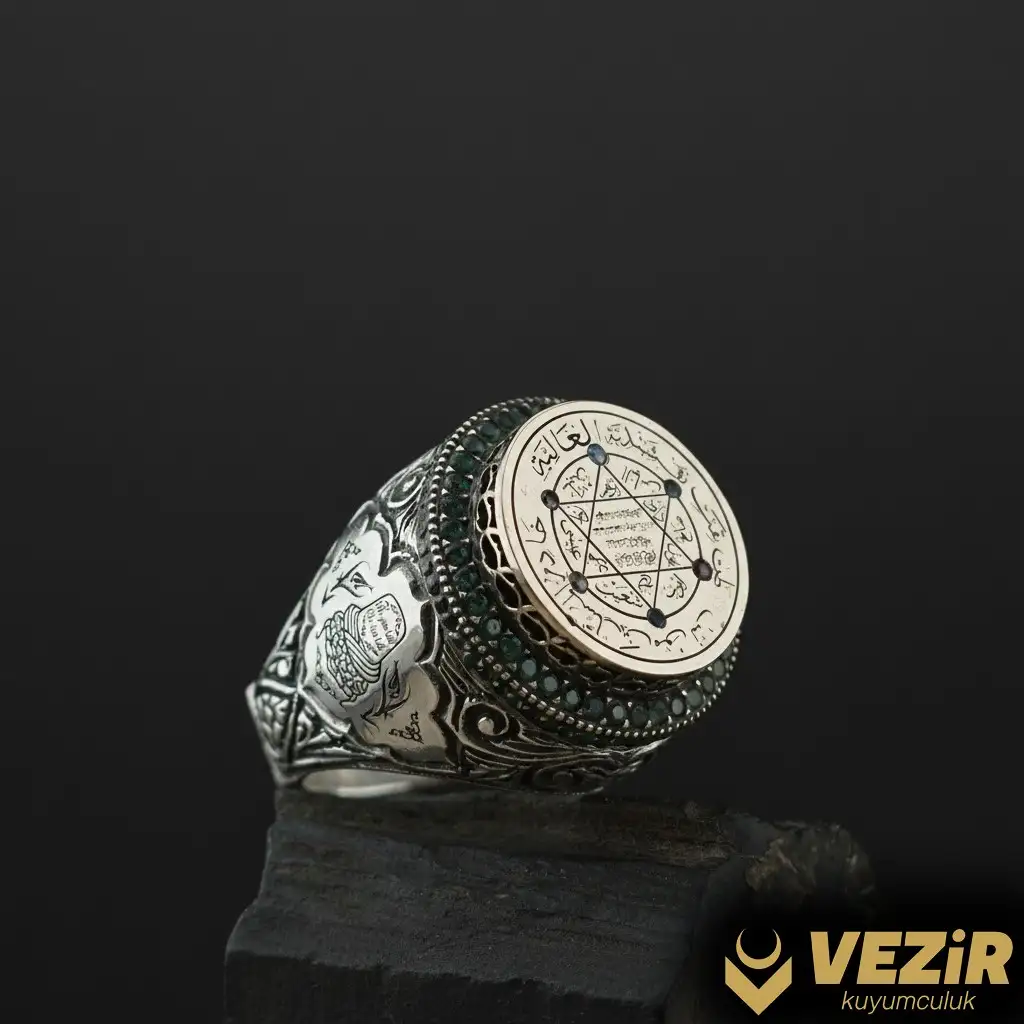 Yüzüğün çevresinde el kalemi ile işlenmiş Osmanlı motifleri, mücevhere geleneksel bir hava katar. Bu detaylar, Osmanlı kültürünün zenginliğini ve tarihini yansıtır. İç kısmında ise Mevlana’nın sembolü olan kavuk yer alır. Bu sembol, yüzüğün manevi değerini artırır ve Mevlana’nın öğretilerini hatırlatır.