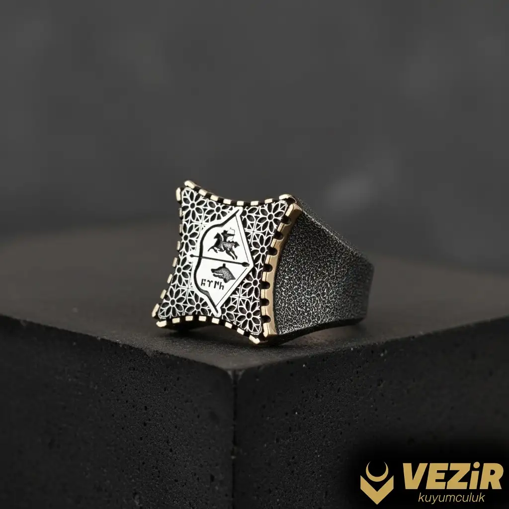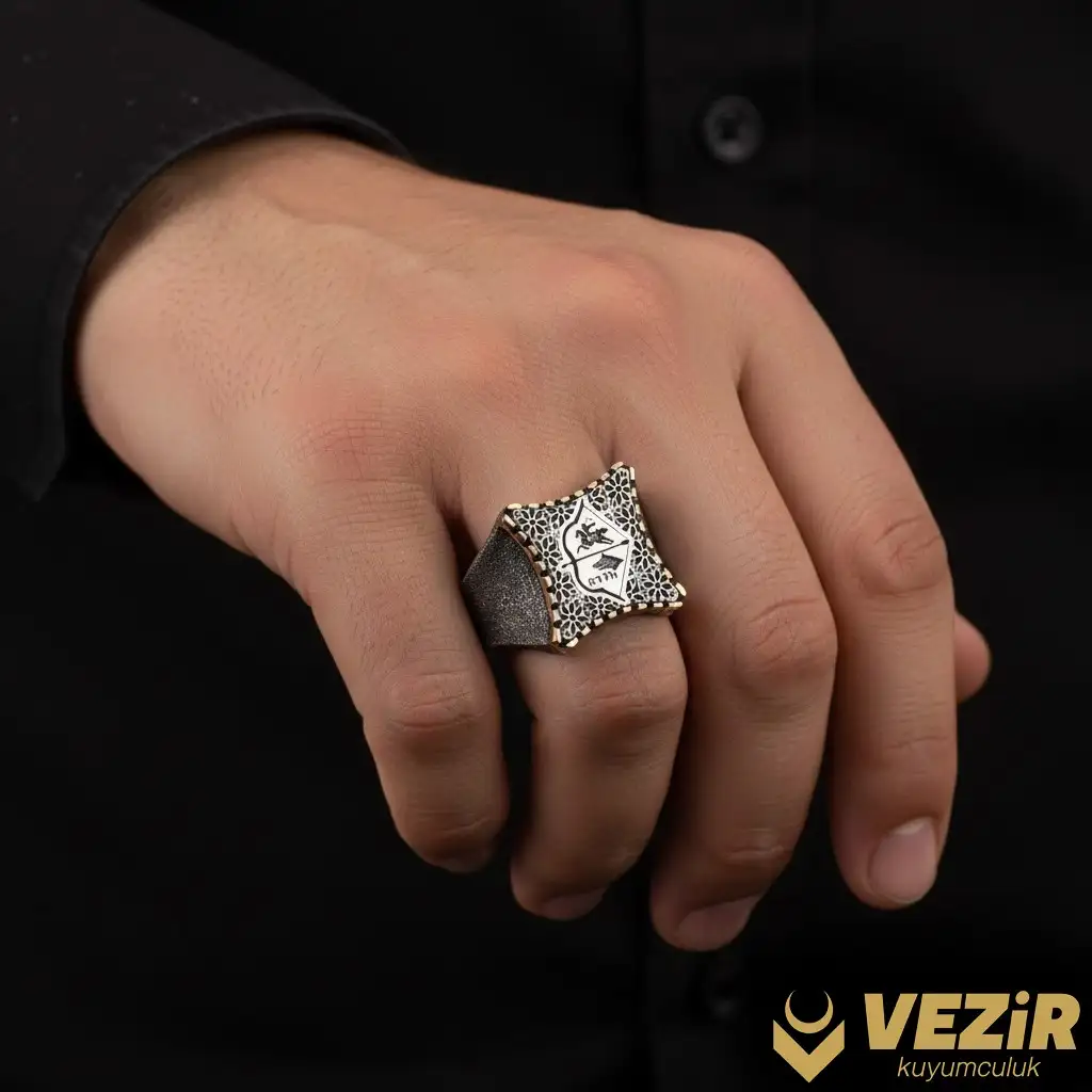 Kaliteli İşçilik: Bu yüzük, Vezir Kuyumculuk’un özenli işçiliği ile üretilmiştir. Gümüşün parlaklığı ve dayanıklılığı, bu yüzüğe uzun ömürlü bir kullanım imkanı sunar. Kalem işçiliği ile işlenmiş gravür desenleri ve Türklük simgelerinin zarif işlemeleri, bu yüzüğü özel bir hale getiriyor.