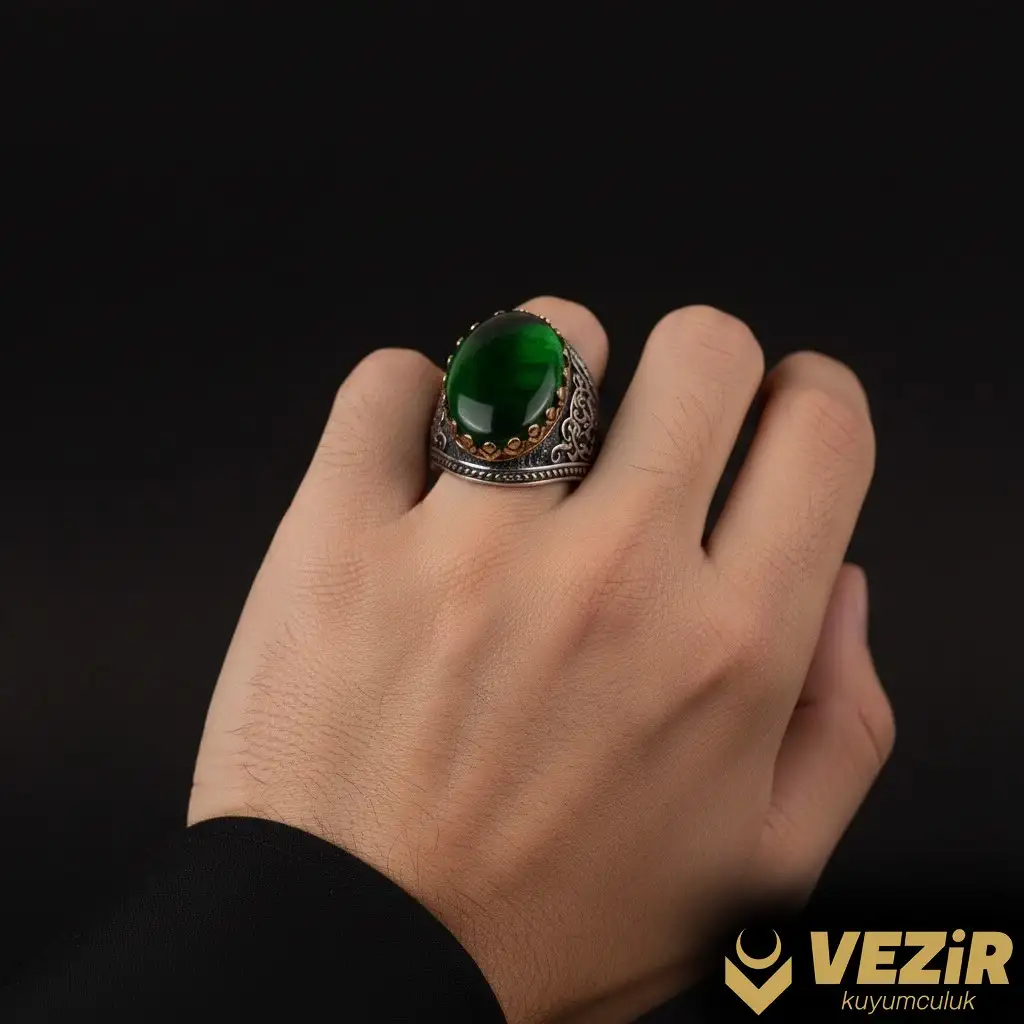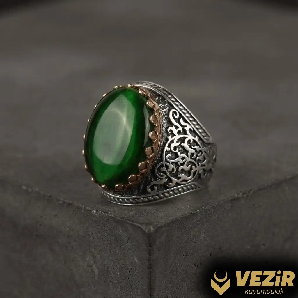 Bu yüzüğün odak noktası, yeşil ateş kehribar taşıdır. Ateş kehribar, organik kökenli bir taş olup, renk ve parlaklık açısından oldukça çeşitlidir. Yeşil ateş kehribar, doğanın tazeliğini ve huzurunu temsil eder. Bu taş, ışığı farklı açılardan yansıtarak muhteşem bir ışıltı sağlar. Yeşil ateş kehribar, sakinleştirici etkisi ve pozitif enerjiyi artırma yeteneği ile bilinir. Doğal ve canlı yeşil tonu, yüzüğe estetik bir cazibe katar.